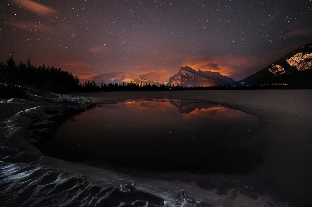 The Vermilion Lakes in Banff National Park are famous for their spectacular sky at sunrise and sunset, as well as their snow and ice formations in winter. However, few photographers have shot night scenes here. As an Alberta based photographer, I’m constantly looking for unique compositions and lighting conditions of these lakes, and this is one of them.