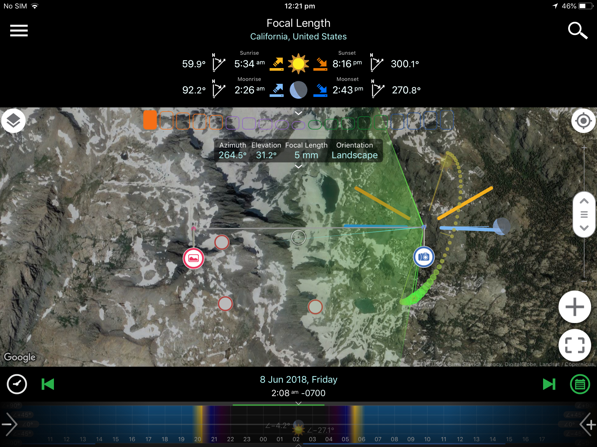 Since I had been to Minaret Lake in 2013, I knew where would be a desirable shooting location. To make our plan as precise as possible, we used Planit! to set our preferred camera location and the scene location that included Minaret peaks into the frame. Then by sliding the time-bar, the app would automatically show the prediction of the Milky Way appearance position in relation to the pre-defined composition.